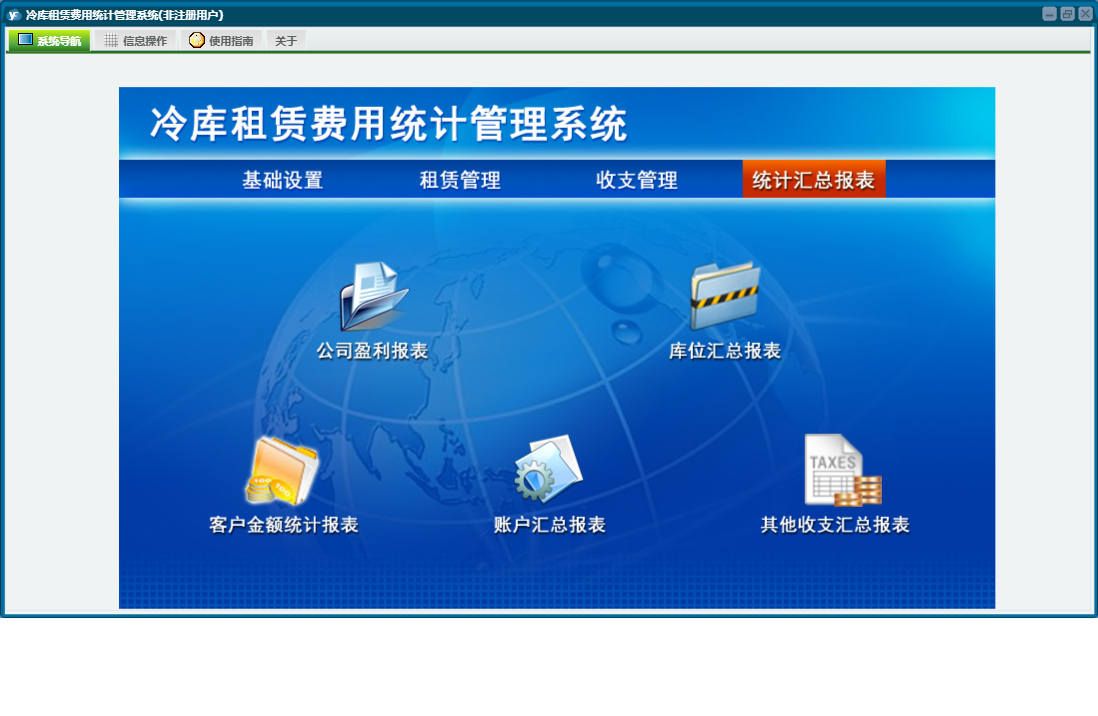 冷库租赁费用统计管理系统包含以下功能:基础设置、客户档案、租赁明细、支出登记、收入登记、日志、租赁管理、关于、权限设置、收支管理、统计汇总等