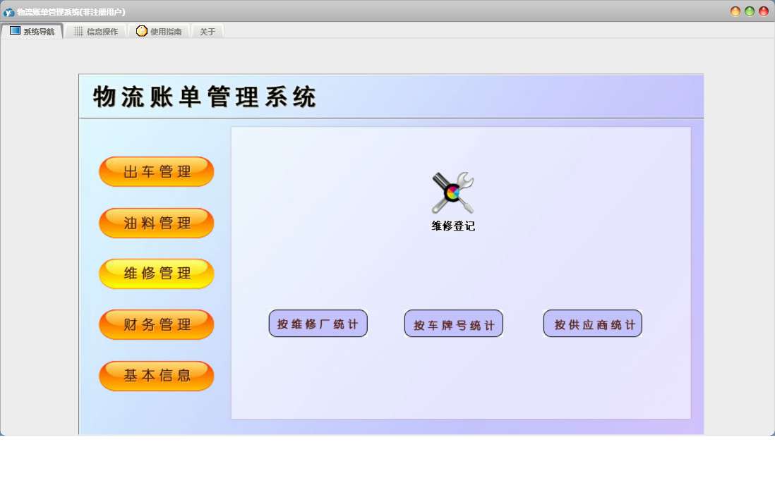 物流账单管理系统包含以下功能:维修登记、配件供商、其它开支、目的地、财务管理、加油登记、物资信息、出车登记、付款登记、维修厂、权限设置、收款登记、回车登记、维修管理、派车登记、关于、基本信息、卡充值、加油站、客户信息、车辆信息、外调车队、油料管理、日志、发票登记、驾驶员信息、起始地等