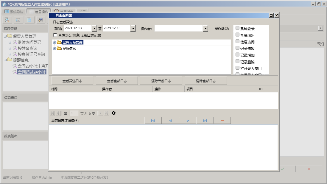 公安派出所留置人员管理系统包含以下功能:关于、权限设置、面板、日志等