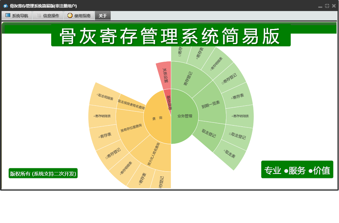 骨灰寄存管理系统简易版包含以下功能:取走登记、面板、按寄存位置查询、按火化人姓名查询、日志、关于、权限设置等