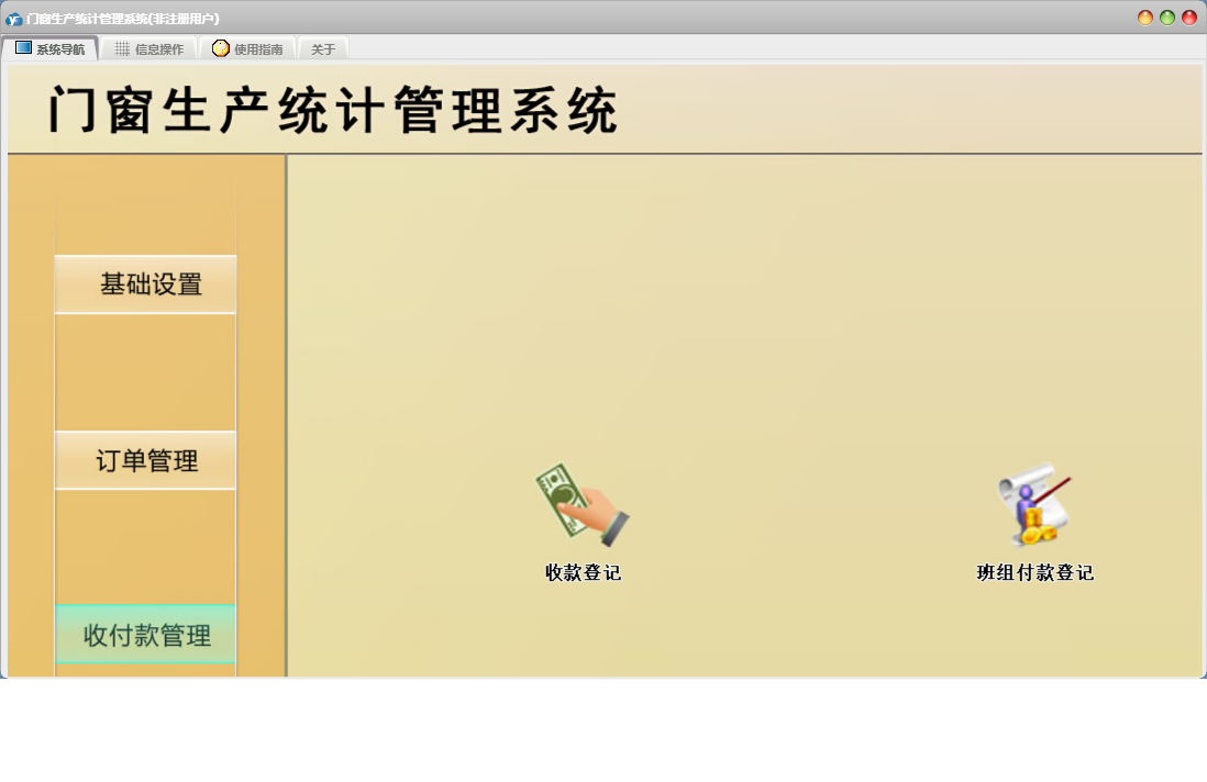 门窗生产统计管理系统包含以下功能:收付款管理、统计与汇总、供应商信息、基础设置、订单登记、订单管理、日志、关于、权限设置、客户信息、收款登记、本单位信息、班组付款登记等