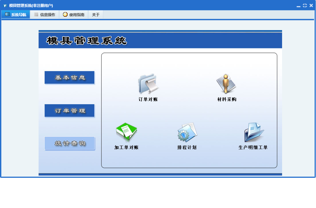 模具管理系统包含以下功能:订单管理、日志、关于、基本信息、权限设置、统计查询等