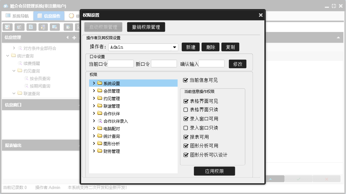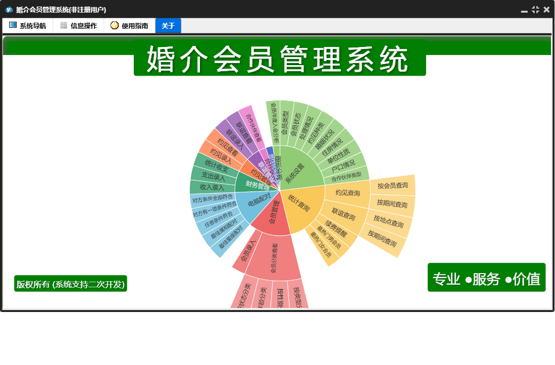 婚介会员管理系统包含以下功能:合作伙伴录入、合作伙伴、电脑配对、财务管理、联谊管理、权限设置、统计查询、约见查看、会员录入、收入录入、关于、系统设置、图形分析、会员管理、支出录入、日志、联谊录入、联谊查看、约见管理、合作伙伴查看等