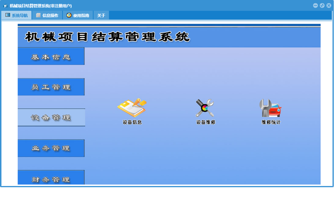 机械项目结算管理系统包含以下功能:设备维修、单位信息、设备管理、设备信息、项目登记、员工信息、员工考勤、日志、拖车登记、关于、基本信息、权限设置、收款登记、财务管理、业务管理、施工登记等
