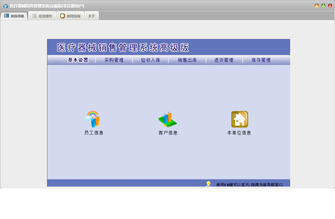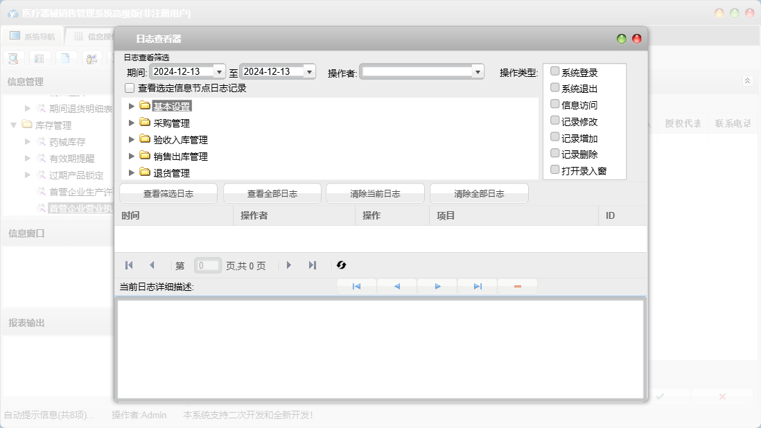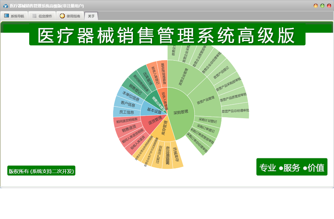 医疗器械销售管理系统高级版包含以下功能:基本设置、采购订单总经理审批、首营产品总经理审批、首营产品登记、验收入库登记、销售开单、退货管理、销售退货、权限设置、采购订单质管部审批、采购订单登记、库存管理、关于、客户信息、首营产品采购部审批、首营企业总经理审批、首营企业登记、员工信息、首营企业质管部审批、验收入库退货、日志、采购管理、采购计划登记、首营产品质管部审批、验收入库、首营企业采购部审批等
