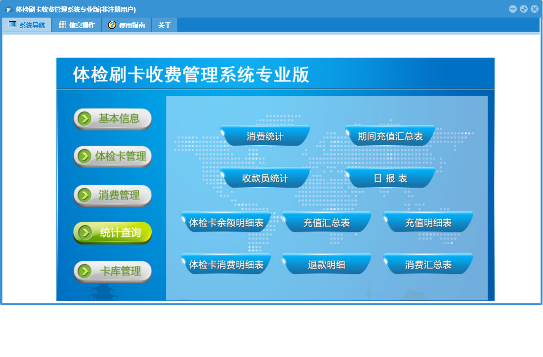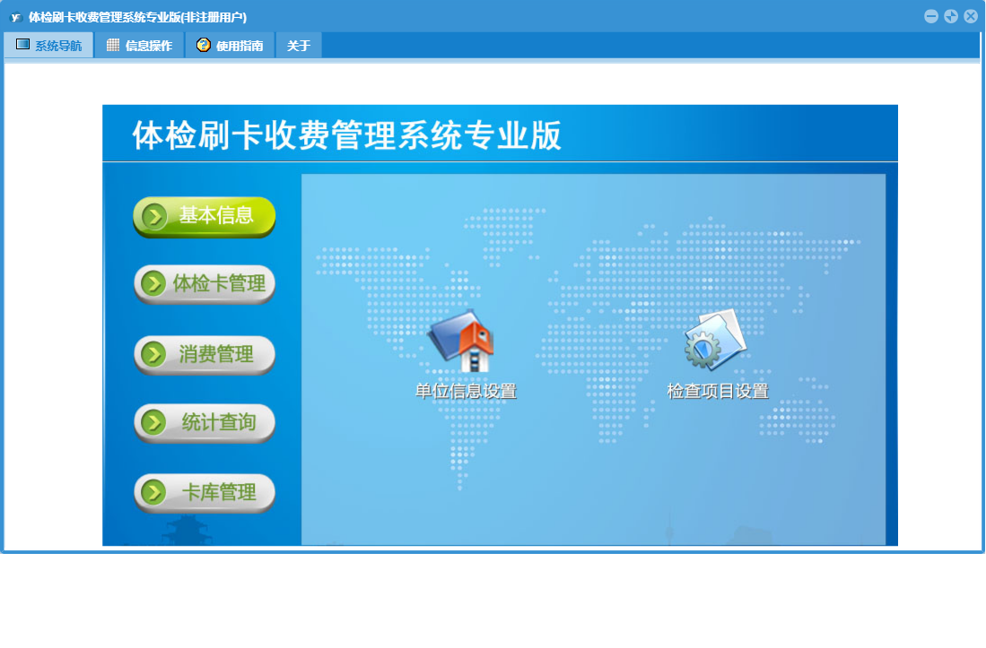 体检刷卡收费管理系统专业版包含以下功能:办卡登记、卡库维护、消费管理、体检卡充值、退款录入、体检卡管理、体检卡禁用、日志、卡库管理、体检卡开通、换卡录入、关于、基本信息、统计查询、权限设置、单位信息设置、检查项目设置、消费登记等