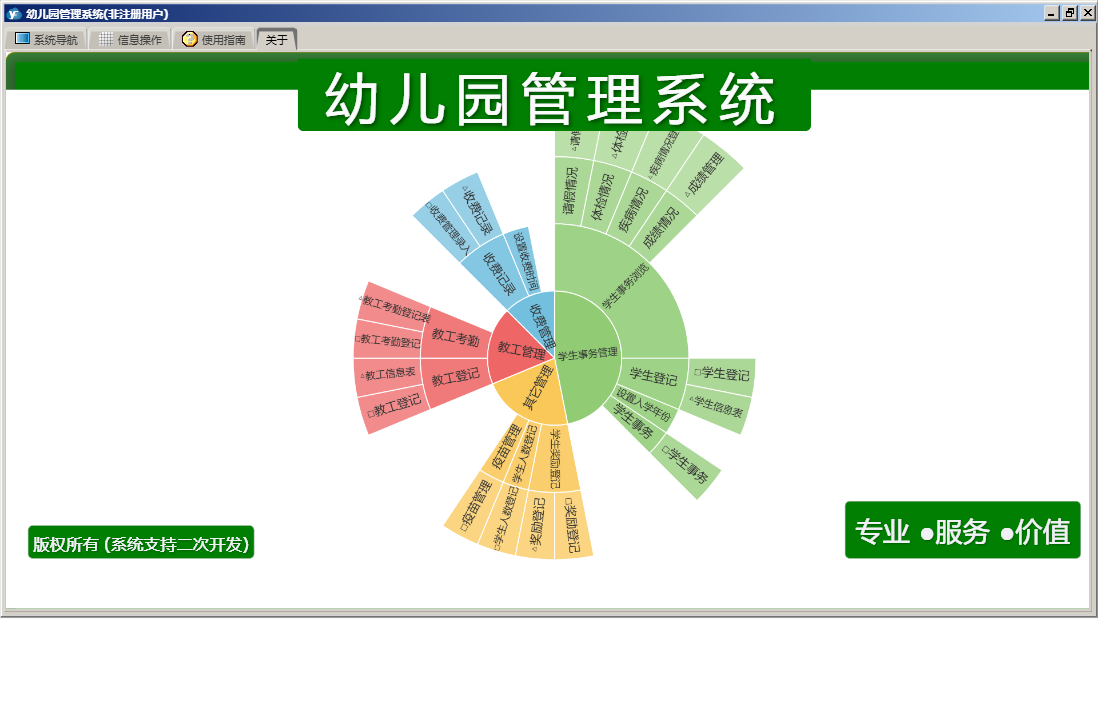 幼儿园管理系统包含以下功能:学生事务管理、收费记录、学生事务、学生奖励登记、教工登记、日志、关于、疫苗管理、学生登记、权限设置、教工考勤、学生人数登记、其他管理、教工管理、收费管理等