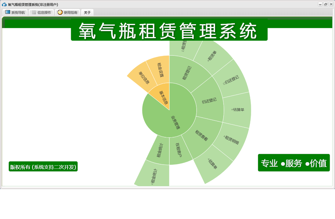 氧气瓶租赁管理系统包含以下功能:面板、日志、关于、权限设置、租赁登记、归还登记等