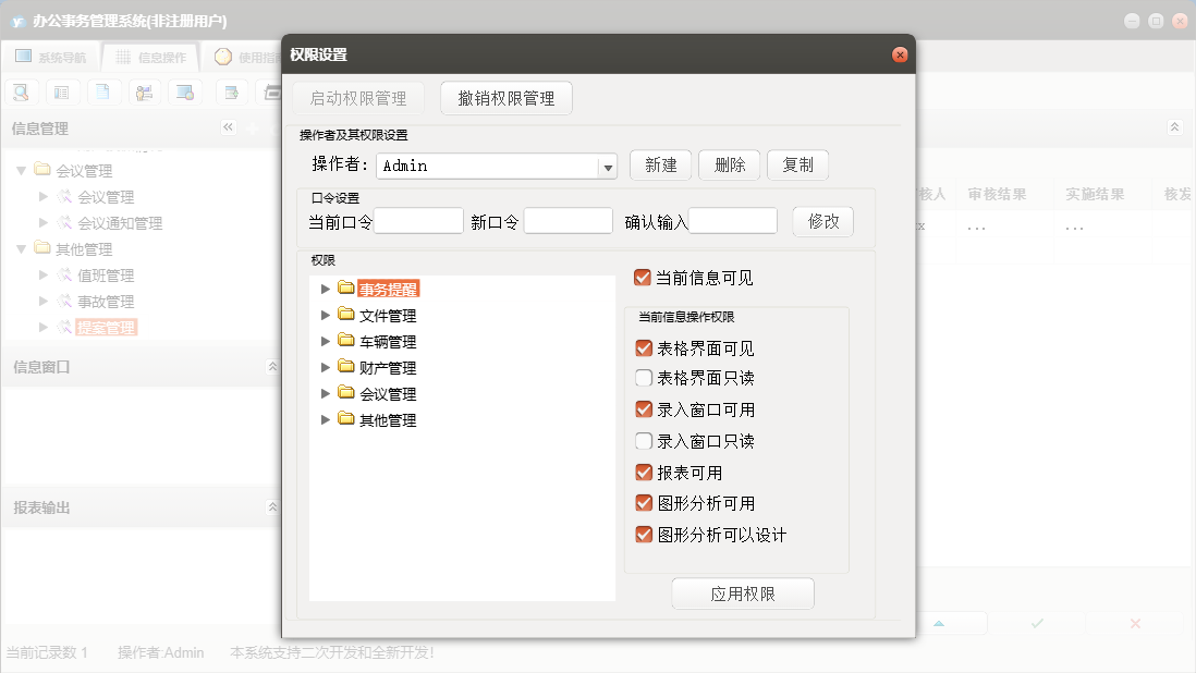 办公事务管理系统包含以下功能:事故管理、车辆使用记录、车辆管理、文件传阅管理、财产维修、会议管理、会议通知管理、文印管理、事务录入、文件管理、文稿管理、财产管理、权限设置、表格请印管理、收文登记管理、财产登记、车辆登记、往来信函管理、财产增减记录、文件督办管理、关于、其他管理、交通事故管理、报表发送管理、客户投诉、财产投保情况、值班管理、行文管理、提案管理、事务提醒、日志、车辆费用支出等