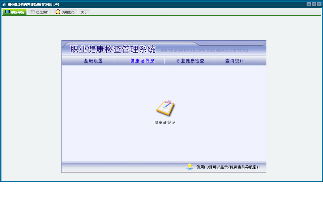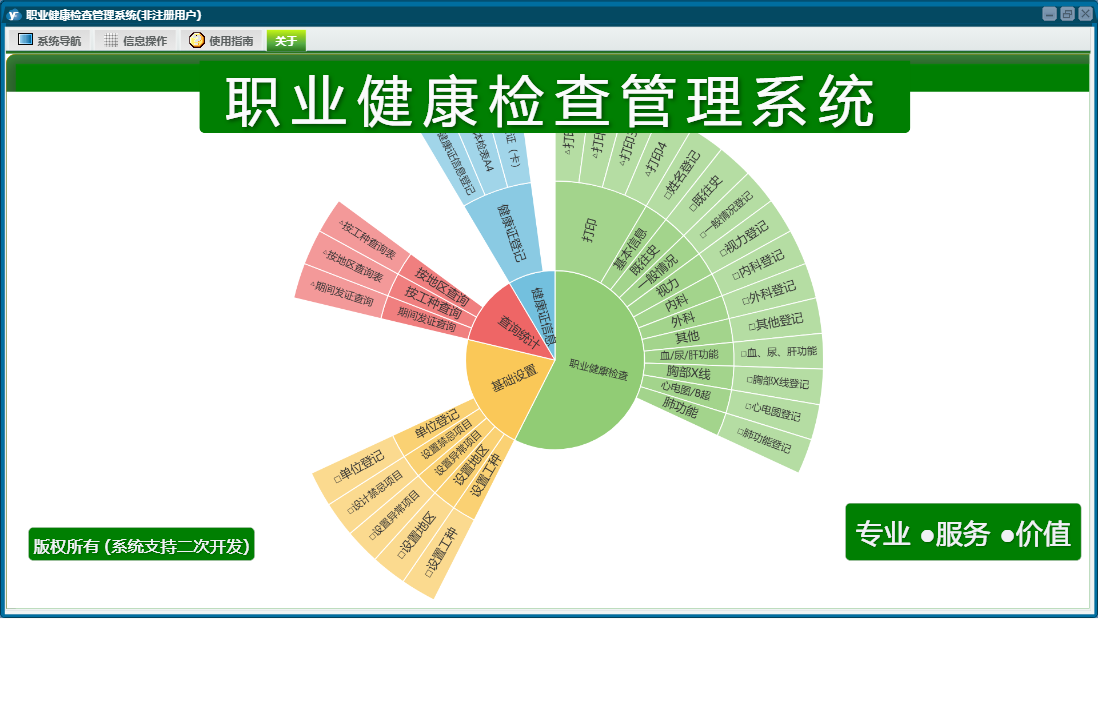 职业健康检查管理系统包含以下功能:血、基础设置、查询统计、健康证登记、视力、健康证信息、设置异常项目、一般情况、胸部X线、既往史、外科、权限设置、内科、肺功能、关于、基本信息、单位登记、职业健康检查、其他、设置工种、日志、设置禁忌项目、设置地区、心电图等
