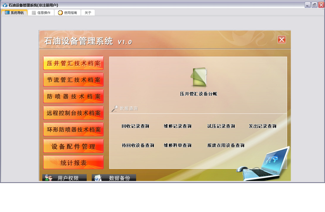 石油设备管理系统包含以下功能:节流管汇技术档案、防喷器技术档案、压井管汇设备台帐、环形防喷器技术档案、回收记录查询、维修记录查询、关于、统计、设备配件管理、压井管汇技术档案、远程控制台技术档案等