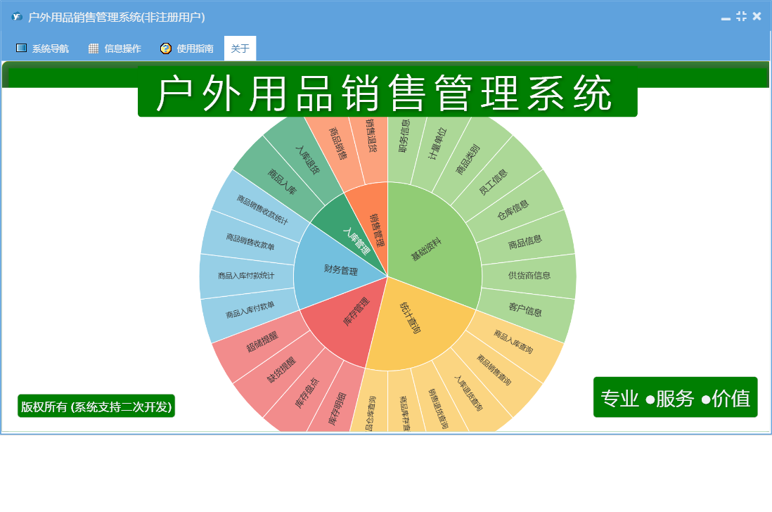 户外用品销售管理系统包含以下功能:财务管理、商品信息、商品入库付款单、商品类别、销售退货、统计查询、权限设置、仓库信息、商品入库、入库退货、商品销售收款单、关于、客户信息、业务管理、商品销售、库存盘点、员工信息、职务信息、供货商信息、日志、计量单位等