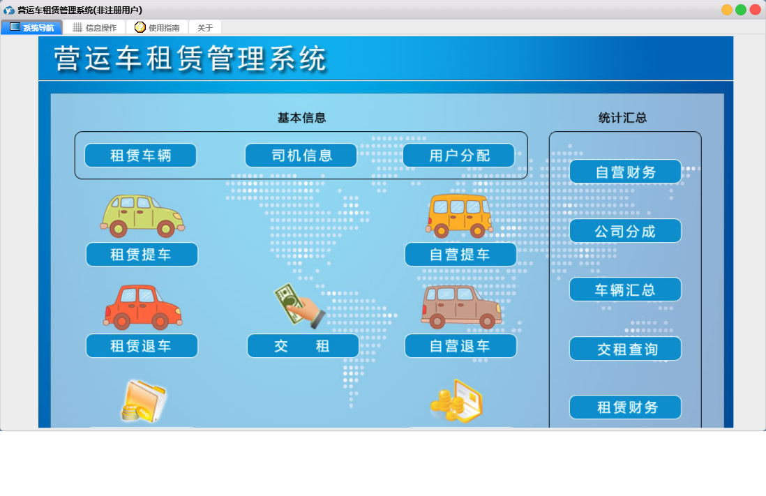营运车租赁管理系统包含以下功能:自营退车、自营结算、租赁退车、租赁车辆、司机信息、日志、交租、自营提车、租赁提车、关于、基本信息、权限设置、用户分配、租赁结算等