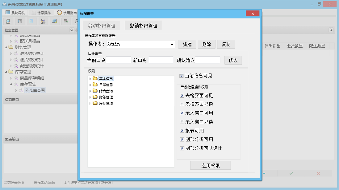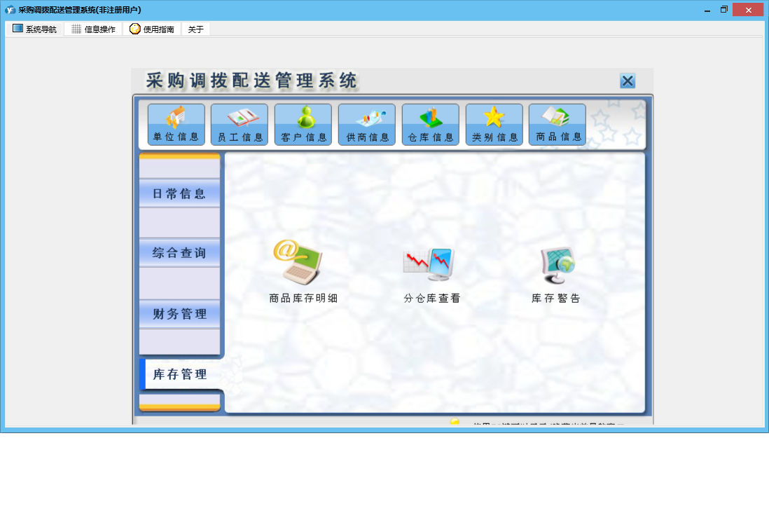 采购调拨配送管理系统包含以下功能:单位信息、商品信息、员工信息、退货信息、配送信息、日志、库存管理、关于、综合查询、权限设置、类别信息、进货信息、客户信息、调拨信息、日常信息、财务管理、仓库信息、供商信息等
