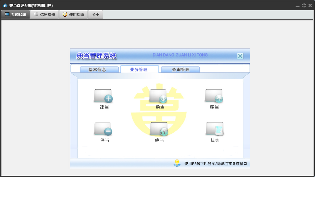 典当管理系统包含以下功能:典当行信息、挂失、续当、建当、绝当、日志、关于、权限设置、基本信息、停当、赎当、查询管理、业务管理等