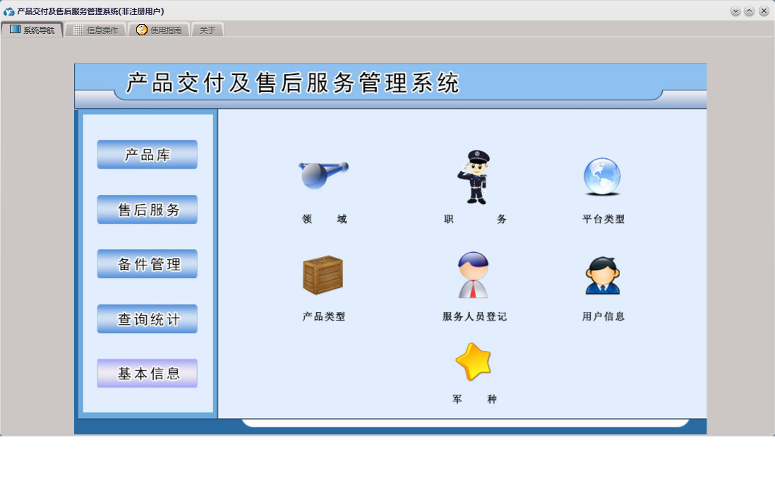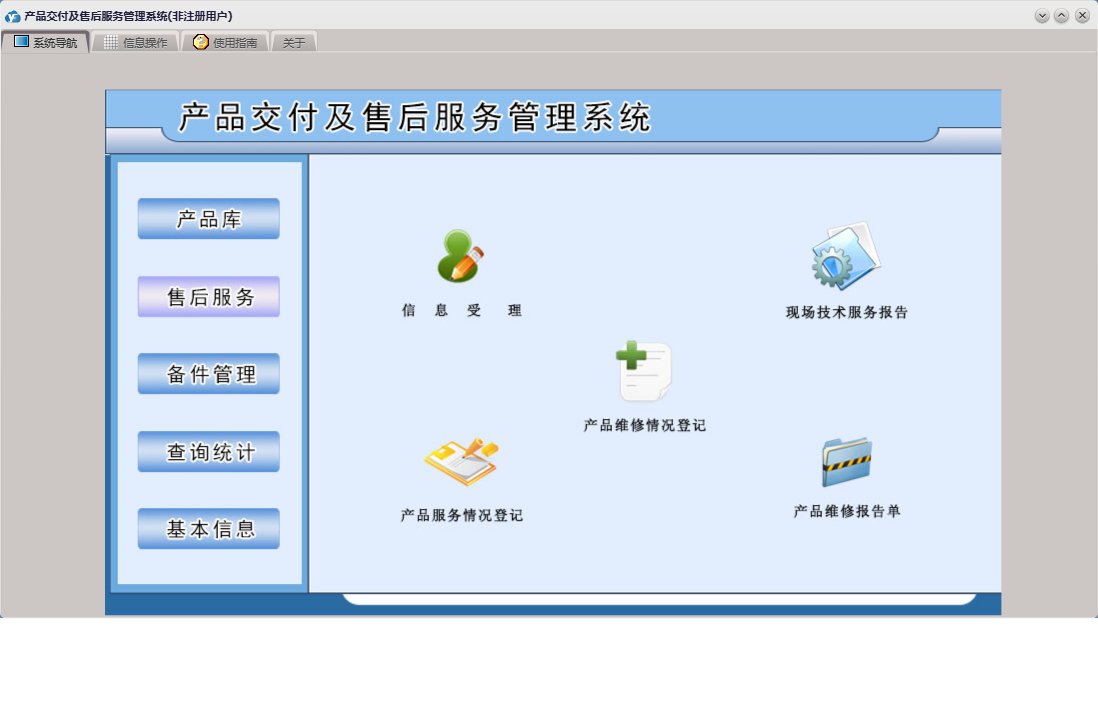 产品交付及售后服务管理系统包含以下功能:查询统计、备件信息、产品库、现场技术服务报告、售后服务、备件出库、产品服务情况登记、服务人员登记、产品维修报告单、信息受理、权限设置、产品信息库、关于、基本信息、产品维修情况登记、备件管理、用户信息、日志、产品交付、备件入库等