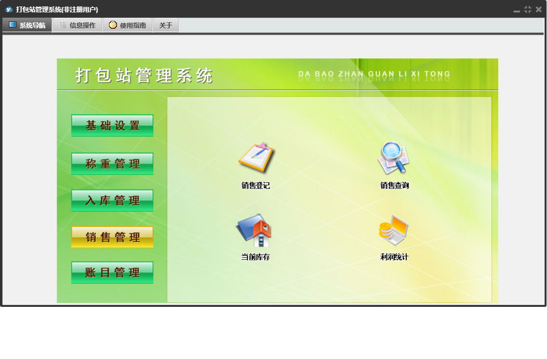 打包站管理系统包含以下功能:称重登记、称重管理、入库管理、基础设置、称重产品、销售管理、客户付款、入库登记、日志、账目管理、打包产品、关于、销售登记、权限设置、客户信息等