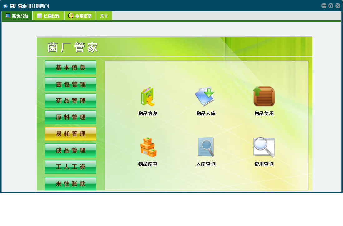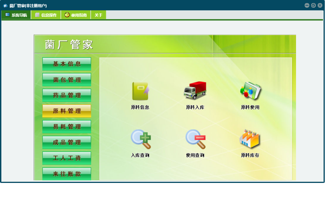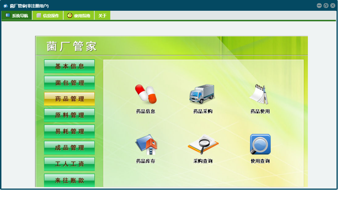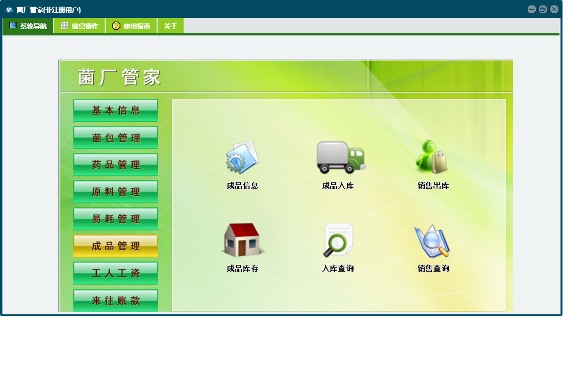 菌厂管家包含以下功能:菌包转房、工人工资登记、成品管理、药品管理、原料入库、药品使用、成品信息、成品入库、菌包入库、药品采购、菌包信息、原料使用、权限设置、销售出库、物品使用、原料管理、药品信息、原料信息、库房号、易耗管理、关于、基本信息、客户信息、物品信息、客户付款、物品入库、工人工资、菌包淘汰、日志、来往账款、菌包管理等