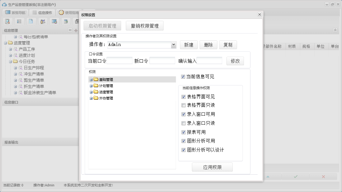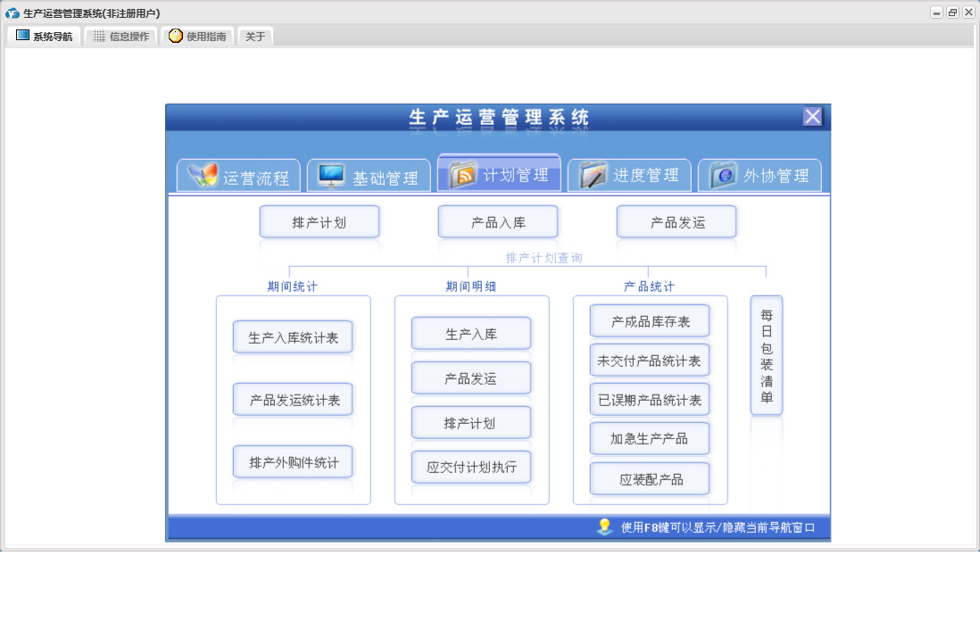 生产运营管理系统包含以下功能:外协件报检、产品发运、外协管理、产品信息、员工变迁、外协计划、本单位信息、进度计划、产品工序、权限设置、计划管理、排产计划、外协订单登记、外协单位、关于、进度执行、基础管理、生产流程、进度管理、员工信息、产品入库、日志、日生产排程等