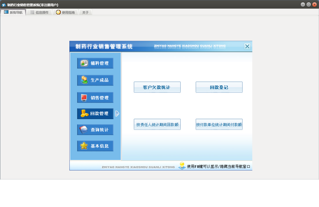 制药行业销售管理系统包含以下功能:销售管理、辅料管理、合同登记、发货登记、生产成品入库、退货登记、辅料出库、回款管理、成品库存盘点、权限设置、销售信息、客户档案、综合查询统计、关于、销售登记、基本信息、回款登记、成品生产、日志、产品目录、责任人、辅料入库等