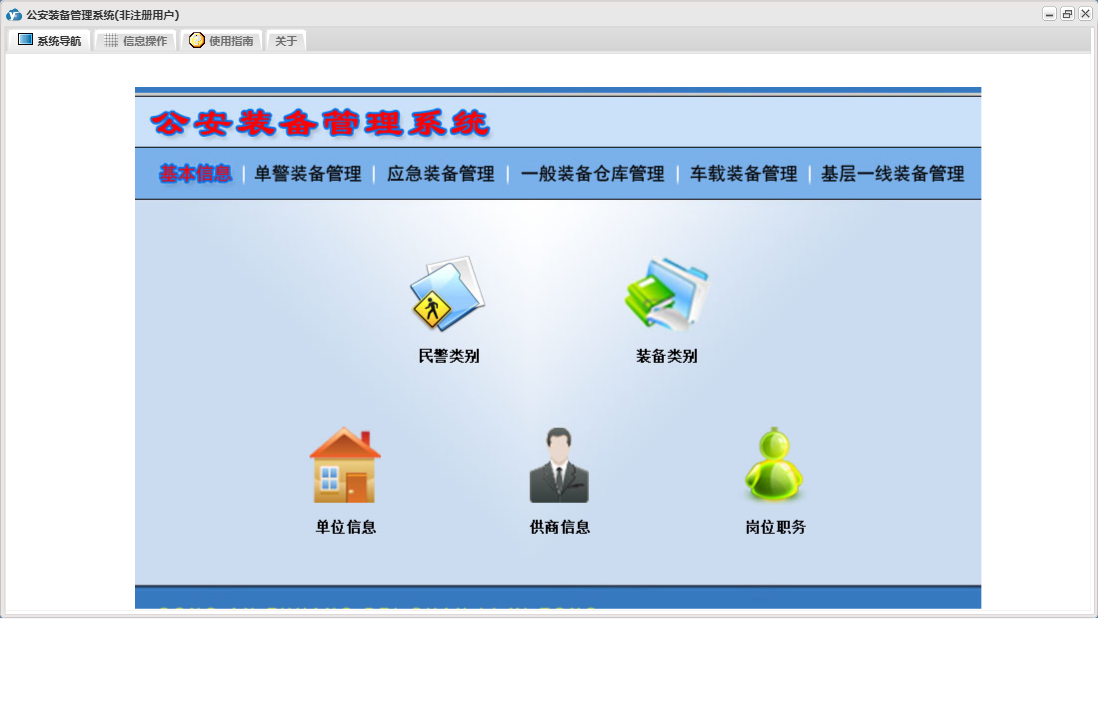 公安装备管理系统包含以下功能:单警装备报损、应急装备出库审批一、应急装备出库审批二、单警装备管理、一般装备仓库管理、一般装备出库、一般装备报损、日志、应急装备管理、车载装备管理、基层一线装备管理、关于、基本信息、一般装备出库审批一、权限设置、应急装备出库、一般装备出库审批二等