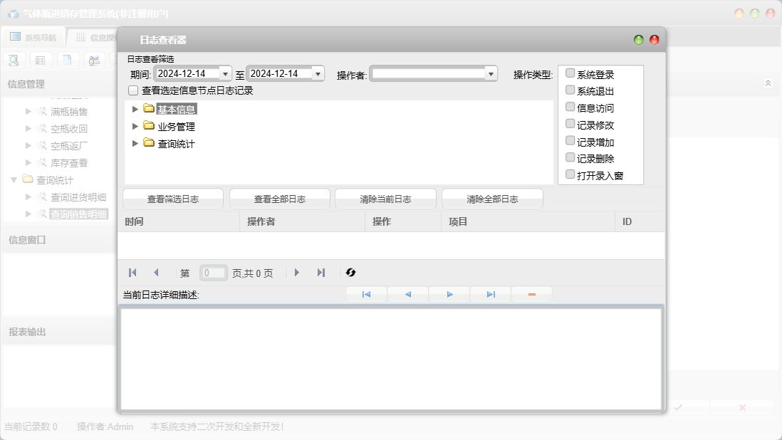 气体瓶进销存管理系统包含以下功能:查询统计、空瓶返厂、空瓶收回、日志、满瓶销售、关于、权限设置、基本信息、气体瓶信息、客户信息、业务管理、满瓶进货、供商信息等