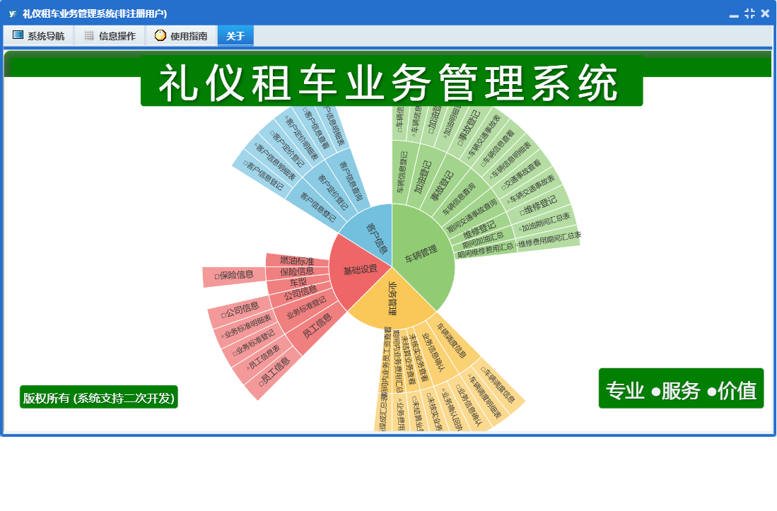 礼仪租车业务管理系统包含以下功能:期间交通事故查询、基础设置、车辆信息登记、维修登记、车辆管理、未结算业务查看、客户定价登记、加油登记、车辆调度信息、未核实业务查看、公司信息、业务标准登记、事故登记、权限设置、车辆信息查询、客户信息登记、关于、客户信息、业务信息确认、业务管理、员工信息、保险信息、日志、客户信息查询等