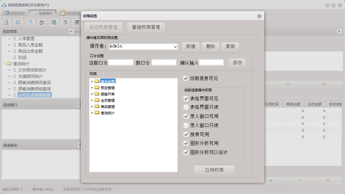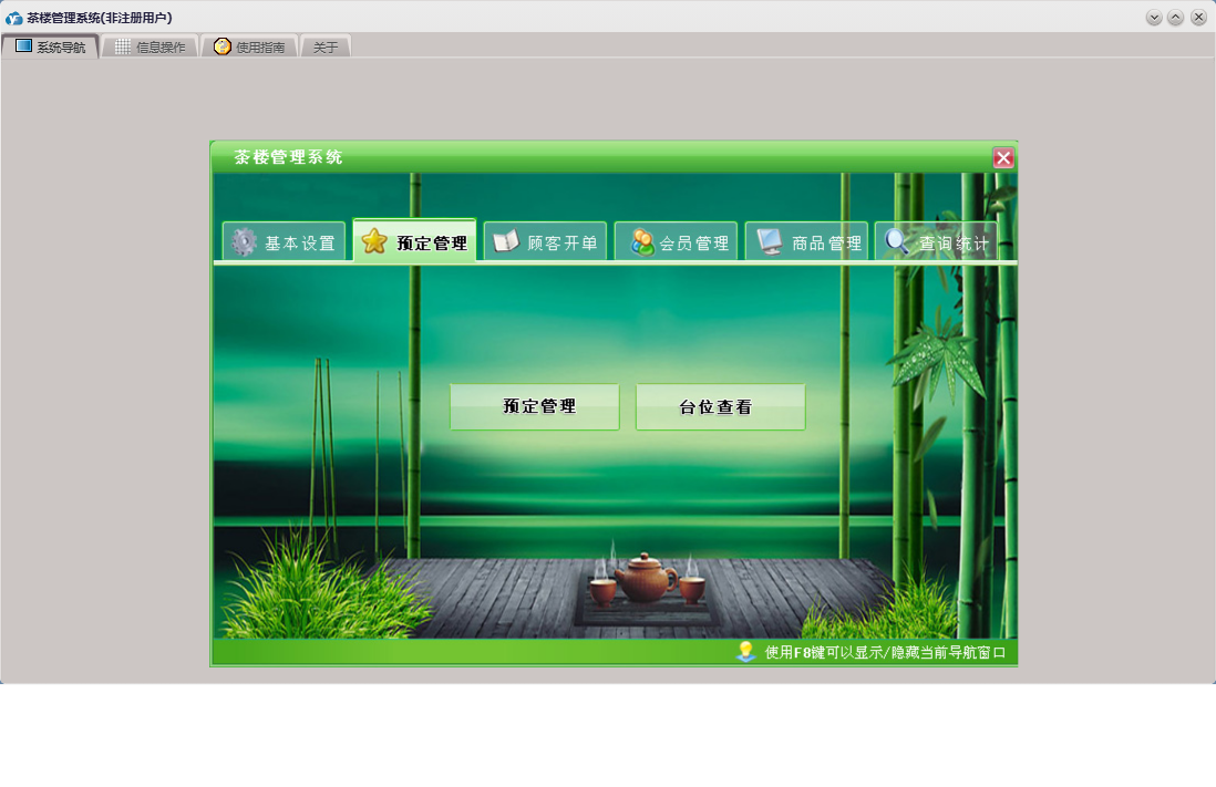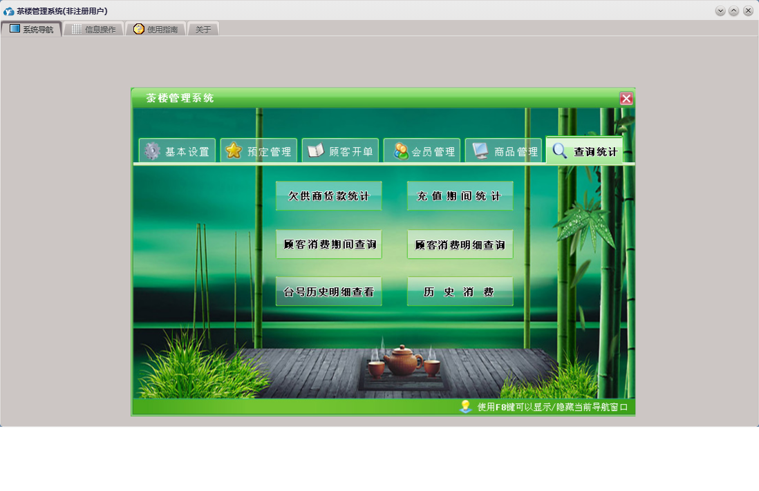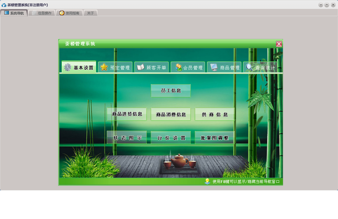 茶楼管理系统包含以下功能:顾客开单、会员信息、查询统计、基本设置、卡类型、状态图示、来宾登记、商品进货信息、商品消费信息、会员卡开通、会员卡禁用、权限设置、预定管理、台位查看、关于、会员卡充值、入库管理、商品管理、会员管理、员工信息、日志、台位设置、实时消费、会员退卡、台号历史明细查看、供商信息等