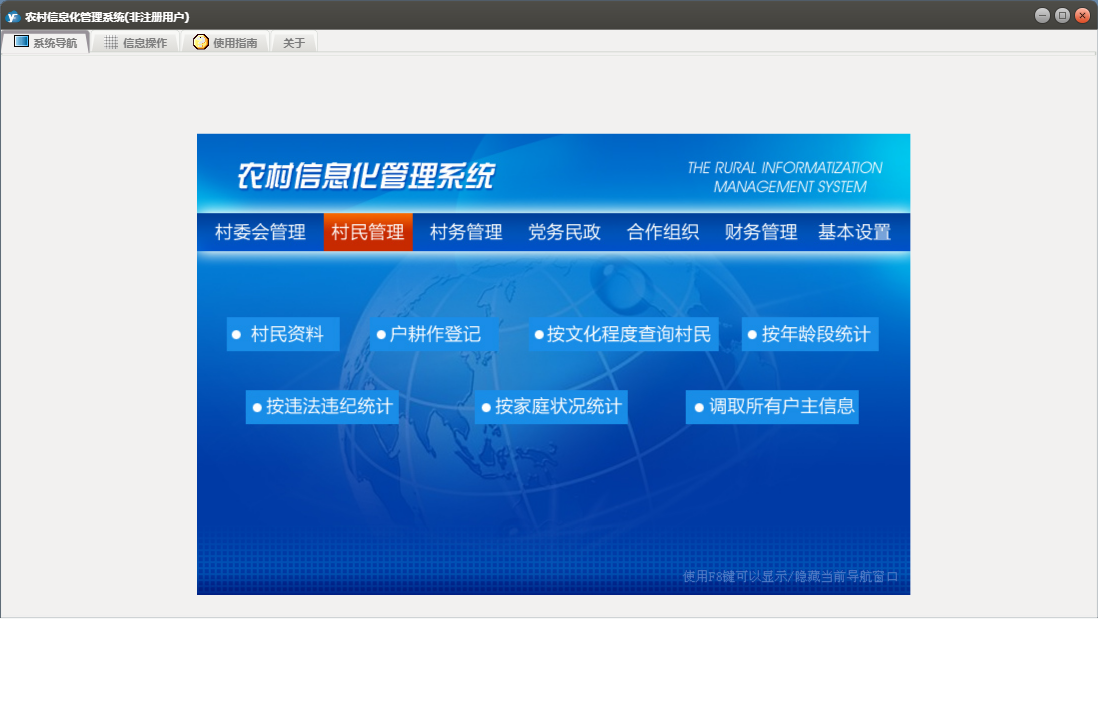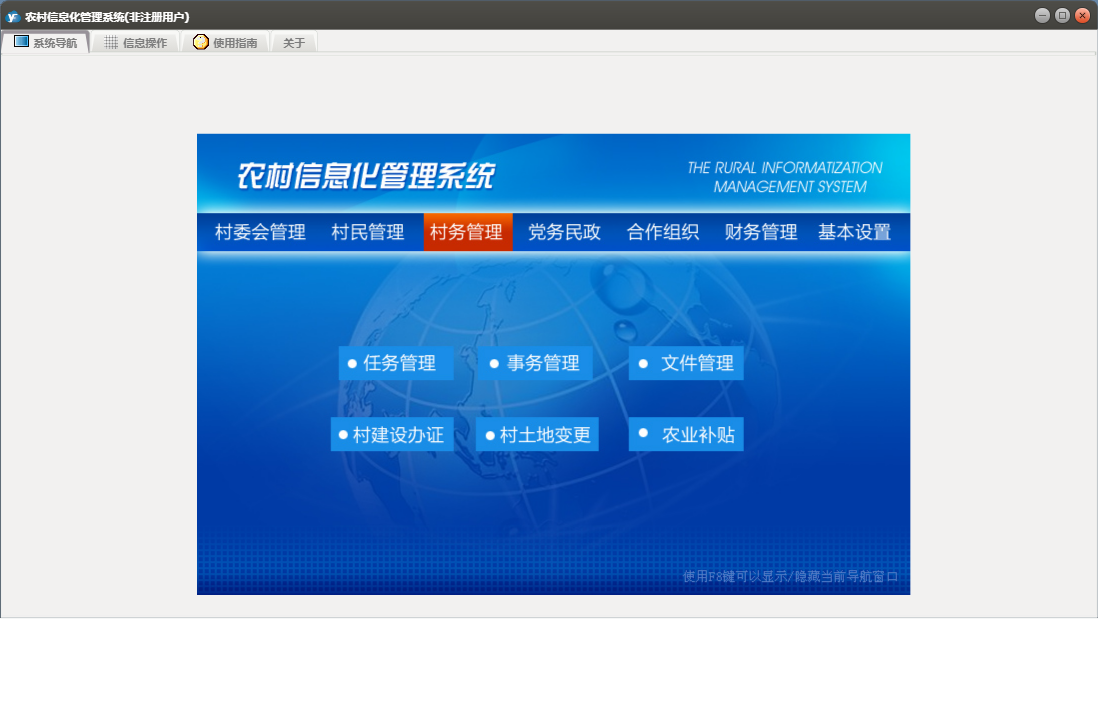 农村信息化管理系统包含以下功能:合作组织、基本设置、预售成交、供货商管理、村建设办证、支出管理、党员信息、收入管理、户耕作登记、财务管理、预售商品定义、村民管理、农业补贴、村土地变更、文件管理、党员变动、权限设置、任务管理、合作社成员、村委会成员、党务管理、村民资料、关于、村委会管理、村务管理、预售登记、预购登记、发展党员、日志、预购成交、事务管理等