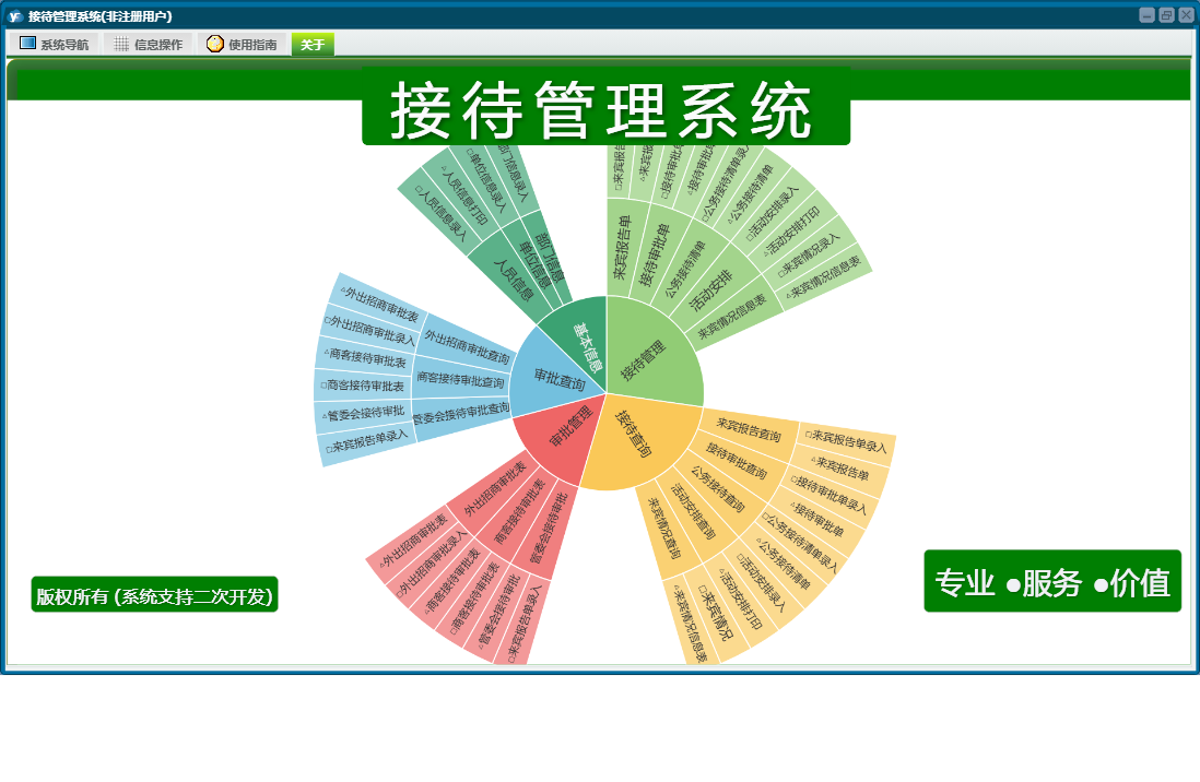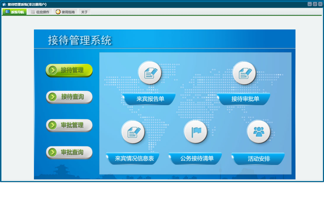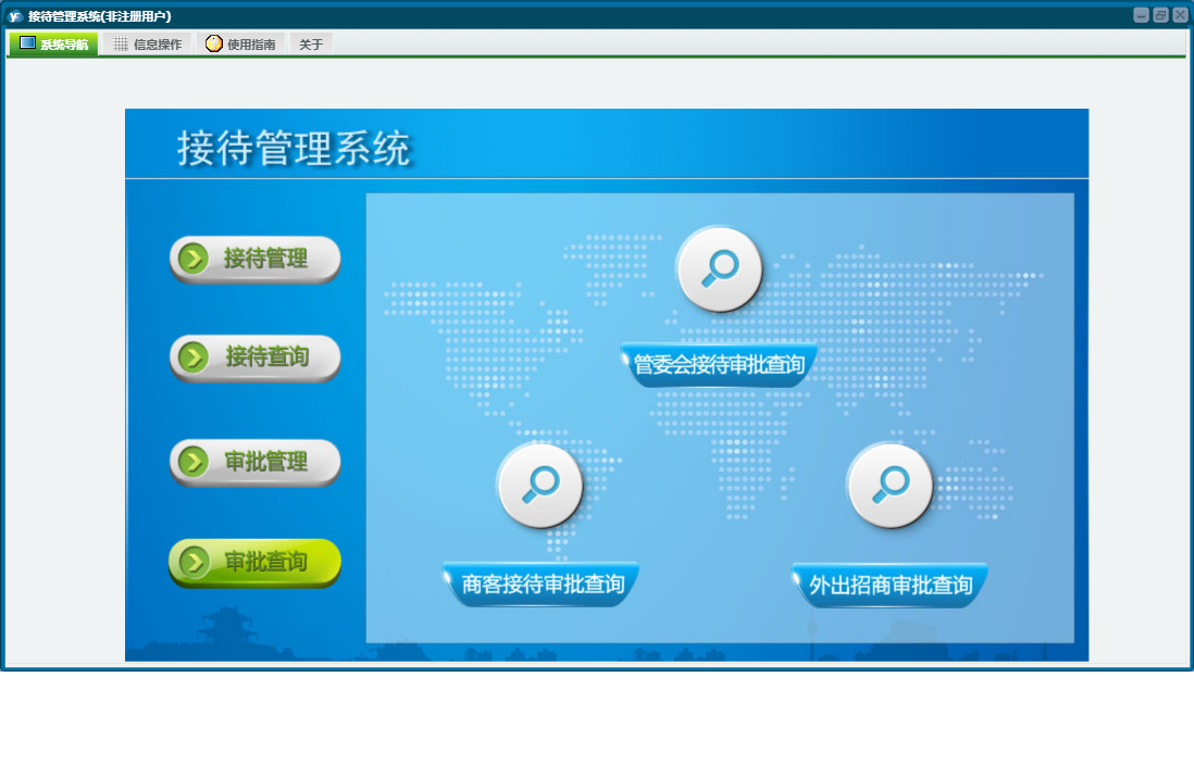 接待管理系统包含以下功能:接待审批单、来宾情况信息表、审批管理、活动安排、商客接待审批查询、来宾报告查询、公务接待清单、外出招商审批查询、权限设置、部门信息、商客接待审批表、管委会接待审批、公务接待查询、来宾情况查询、单位信息、管委会接待审批查询、接待管理、外出招商审批表、关于、审批查询、来宾报告单、活动安排查询、接待审批查询、接待查询、日志、人员信息等