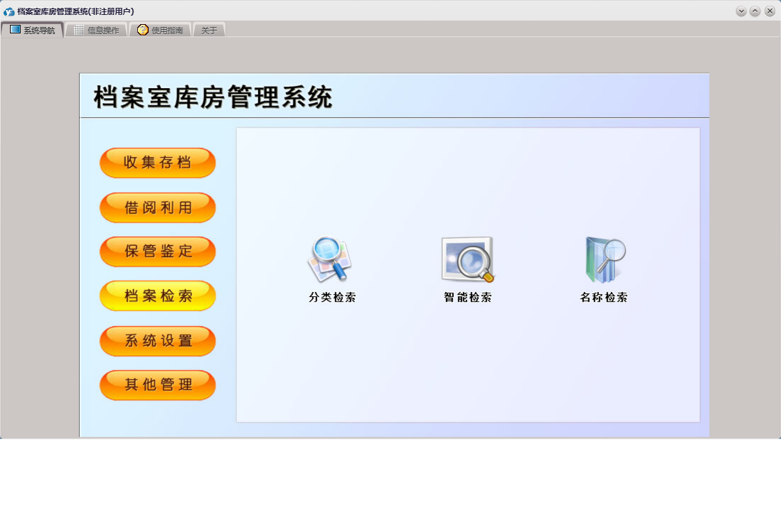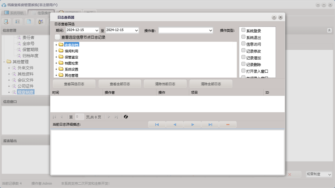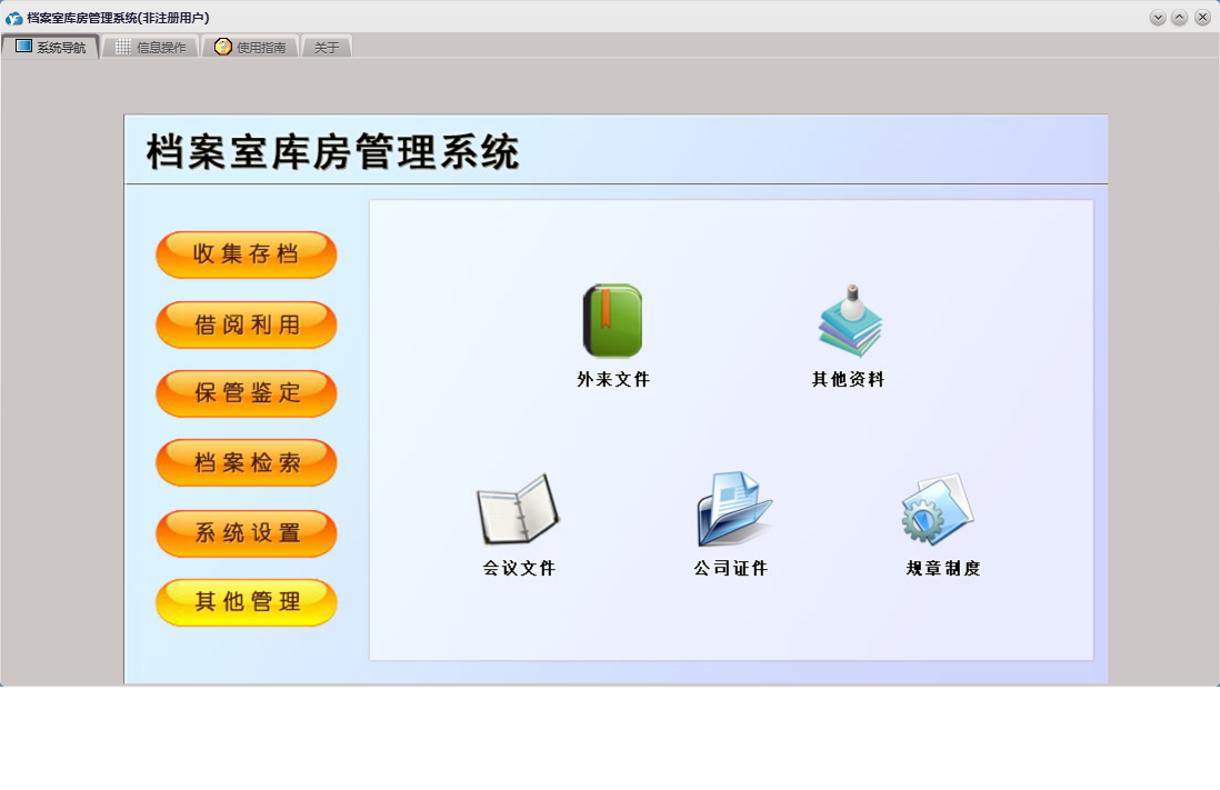 档案室库房管理系统包含以下功能:借阅审批、鉴定销毁、档案类目、库房信息、借阅利用、档案借阅、保管鉴定、外来文件、公司证件、权限设置、部门信息、收集存档录入、收集存档、会议文件、关于、库房温湿度登记、其他资料、其他管理、系统设置、规章制度、档案检索、日志、档案归还、人员信息等
