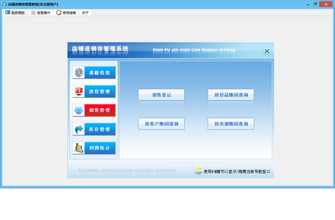 店铺进销存管理系统包含以下功能:基础信息、销售管理、货品信息、进货管理、利润统计、员工信息、日志、库存管理、关于、进货登记、销售登记、权限设置、店铺信息、客户信息、仓库信息、供商信息等