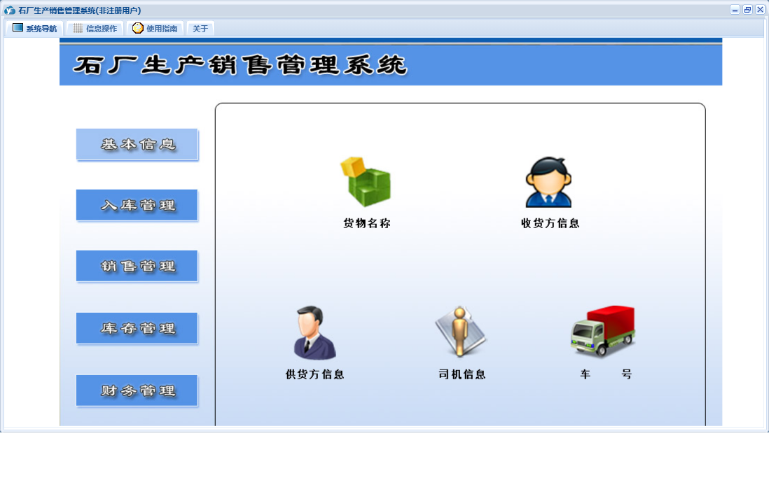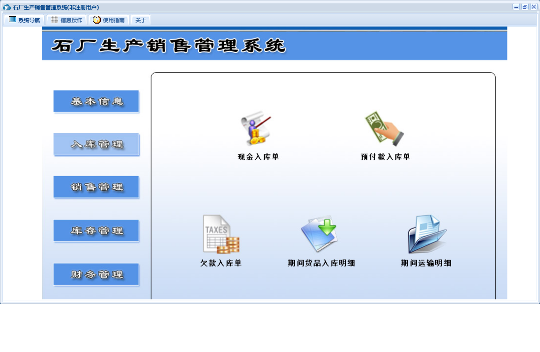 石厂生产销售管理系统包含以下功能:入库管理、销售管理、现金销售单、欠款销售单、日志、库存管理、关于、基本信息、权限设置、现金入库单、财务管理、预收款销售单、欠款入库单、预付款入库单等