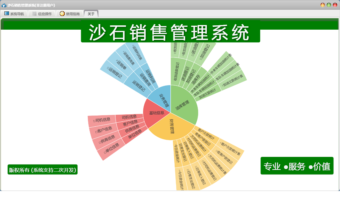 沙石销售管理系统包含以下功能:收客户款登记、财务管理、加油登记、收加油款登记、进油登记、权限设置、单位信息、关于、日常支出登记、客户信息、运销登记、业务管理、油库管理、基础信息、司机信息、日常收入登记、付司机运费登记、日志、供商信息等