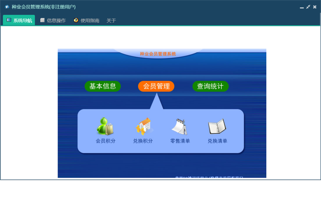 种业会员管理系统包含以下功能:积分设置、会员信息、会员管理、查询统计、兑换积分、日志、关于、权限设置、基本信息、会员积分等