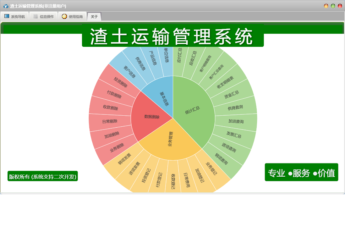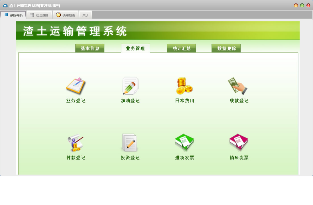 渣土运输管理系统包含以下功能:数据删除、供商信息、日常费用、付款登记、进项发票、业务登记、投资登记、销项发票、统计汇总、关于、产品信息、基本信息、权限设置、日志、客户信息、收款登记、加油登记、业务管理等