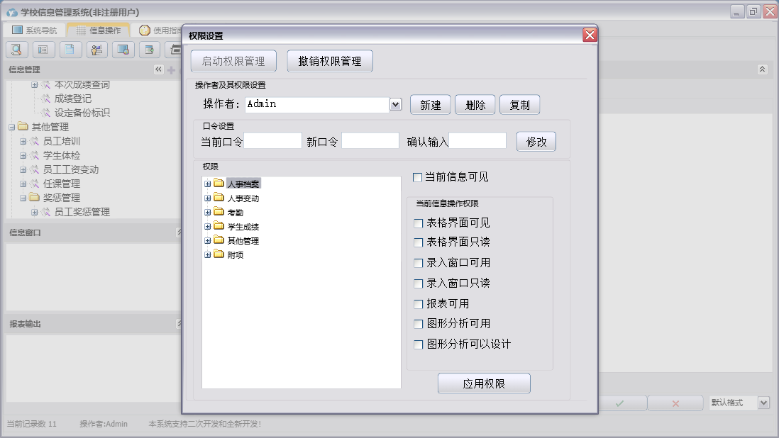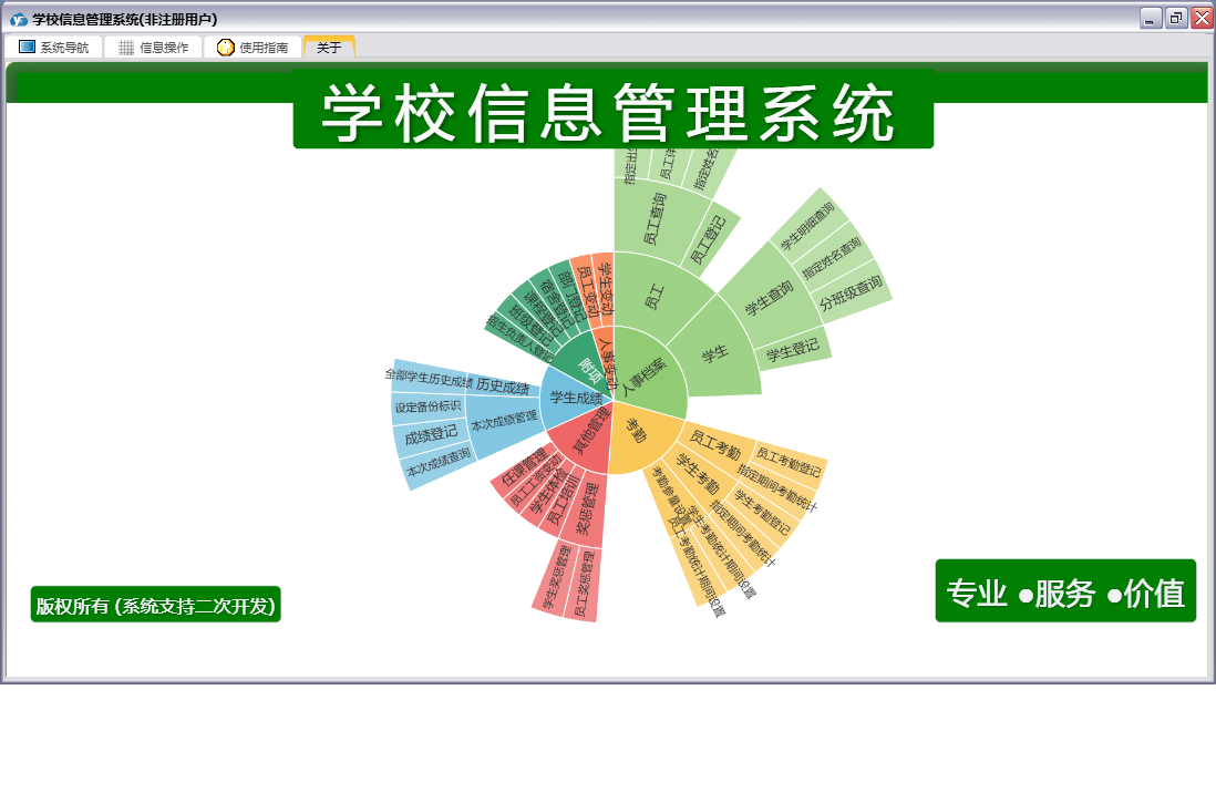 学校信息管理系统包含以下功能:人事变动、学生考勤登记、课程登记、员工考勤登记、学生变动、任课管理、员工工资变动、员工培训、部门登记、宿舍登记、权限设置、学生登记、考勤、班级登记、附项、学生奖惩管理、员工奖惩管理、关于、其他管理、员工变动、员工登记、人事档案、日志、学生成绩、学生体检等