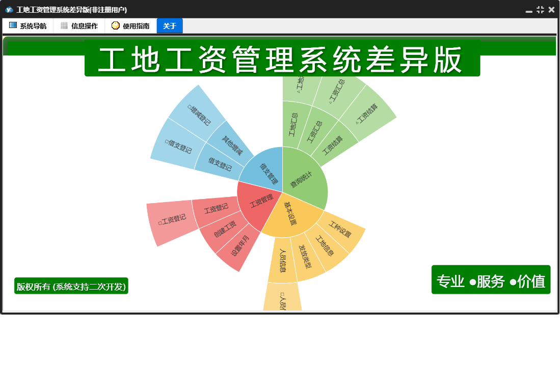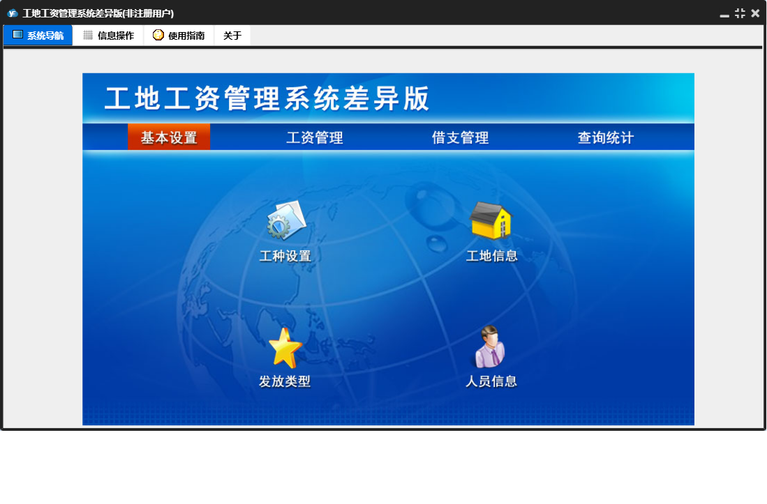 工地工资管理系统差异版包含以下功能:借支管理、借支登记、查询统计、基本设置、日志、关于、权限设置、其他增减、工资登记、工资管理、人员信息等