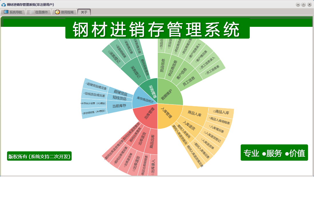 钢材进销存管理系统包含以下功能:商品入库、出库管理、供应商信息、入库退货、客户信息、货品信息、入库管理、库存商品统计、员工信息、日志、采购管理、采购登记、关于、权限设置、出库退货、商品出库、数据维护等