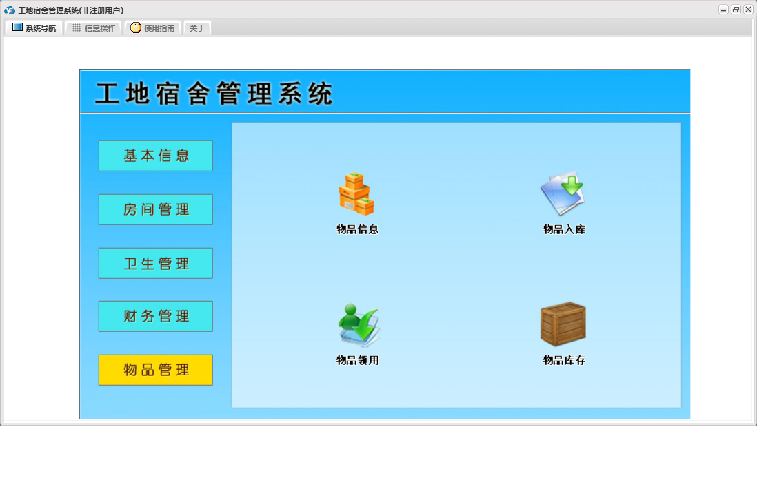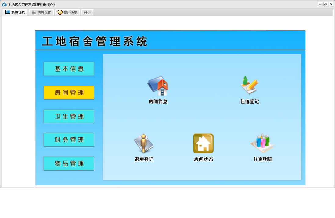 工地宿舍管理系统包含以下功能:房间信息、检查登记、房间管理、财务管理、物品入库、住宿登记、卫生管理、退房登记、日志、关于、基本信息、账户登记、权限设置、物品管理、奖罚登记、物品领用等
