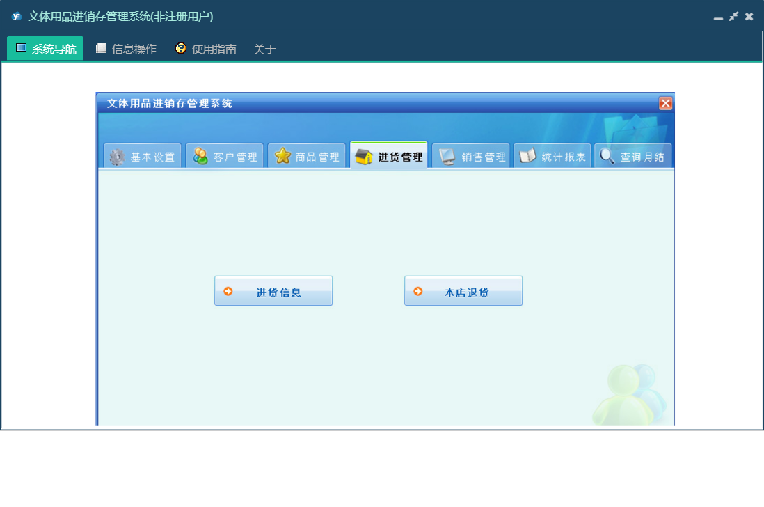 文体用品进销存管理系统包含以下功能:销售管理、零售信息、批发商发卡、退货信息、会员打折卡、使用积分、会员退货、批发退货、商品报溢、商品信息、商品类别、统计、权限设置、仓位货架、过期卡、会员充值、批发信息、关于、基本信息、客户信息、会员积分卡、查询月结、商品管理、商品报损、进货管理、员工信息、供货商信息、日志、进货信息、已退卡、会员退卡等