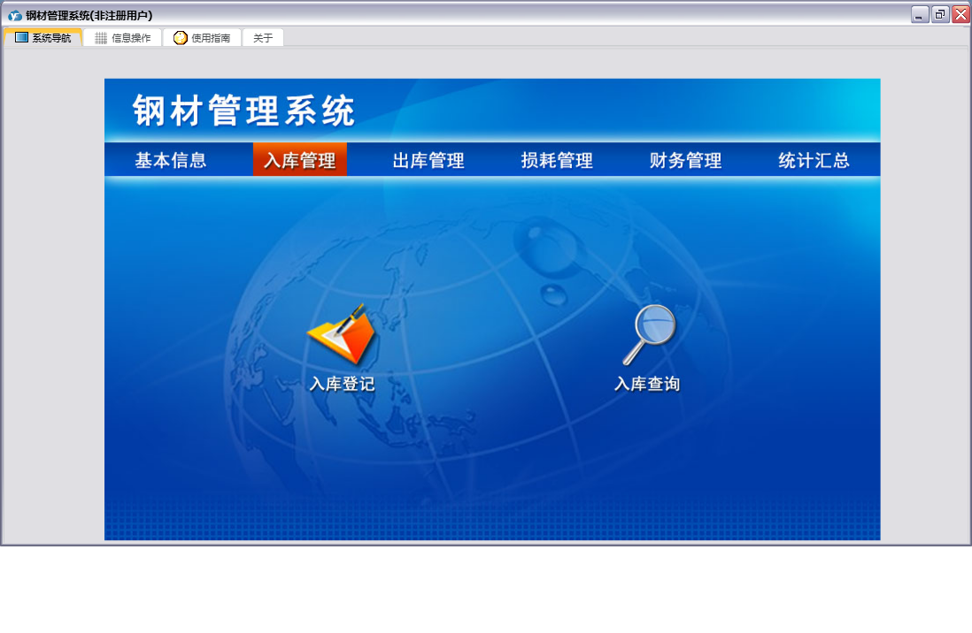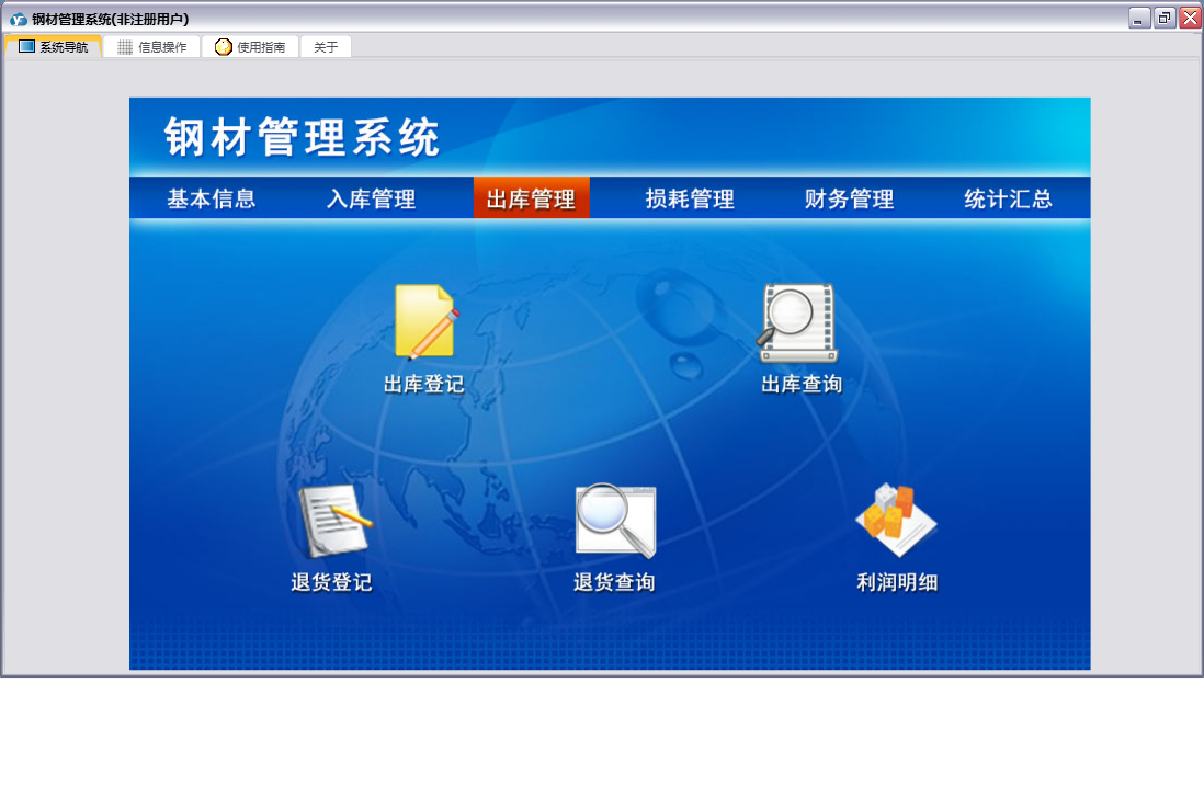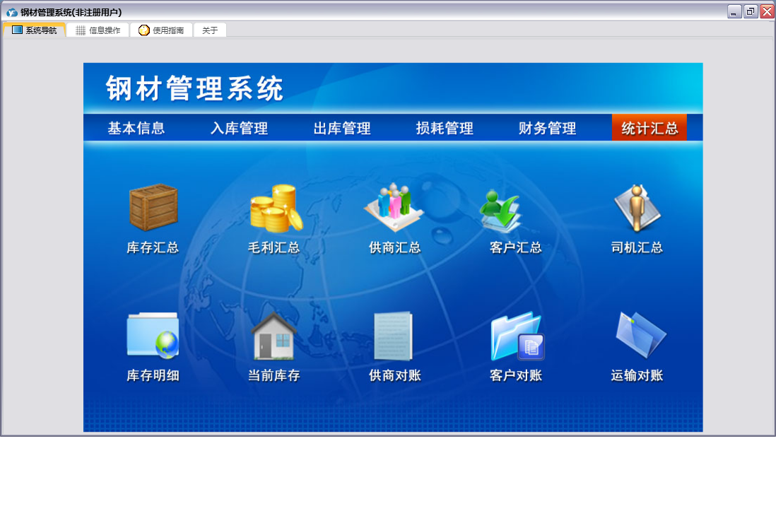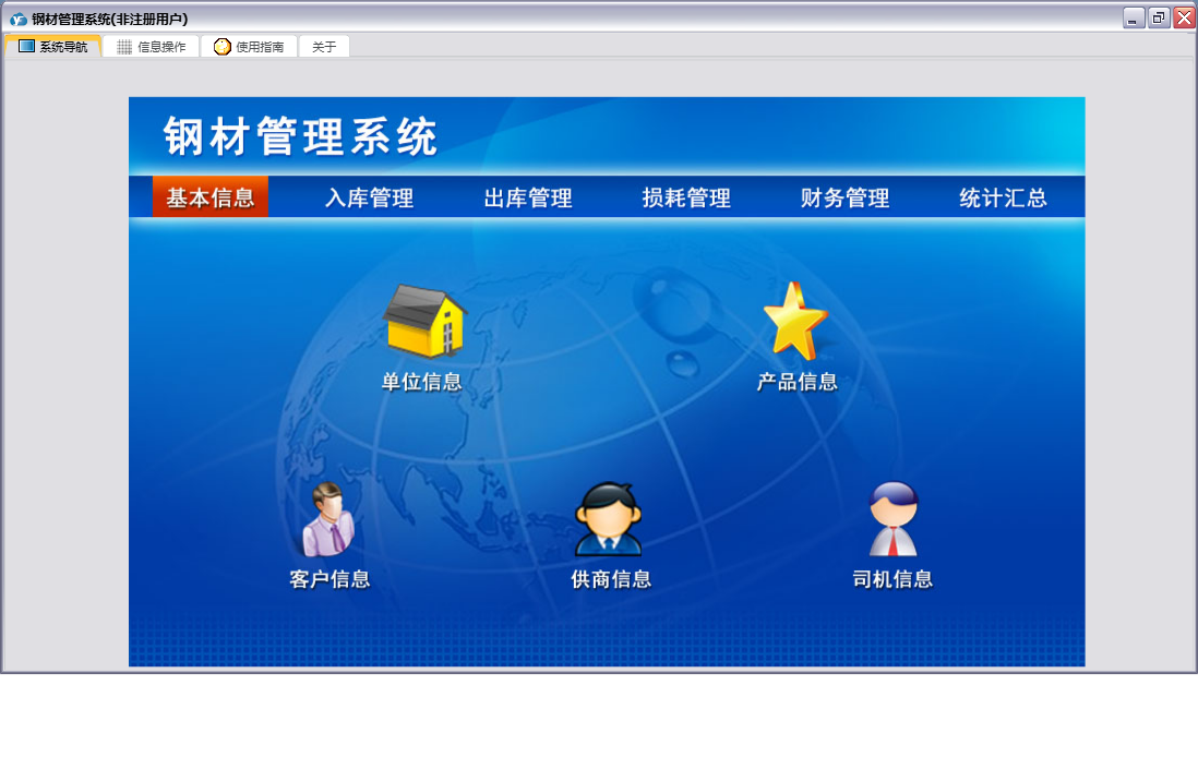 钢材管理系统包含以下功能:运费结算、出库登记、产品信息、收客户款、统计汇总、财务管理、退货登记、入库登记、权限设置、供商付款、出库管理、损耗登记、关于、基本信息、客户信息、入库管理、司机信息、日志、损耗管理、供商信息等