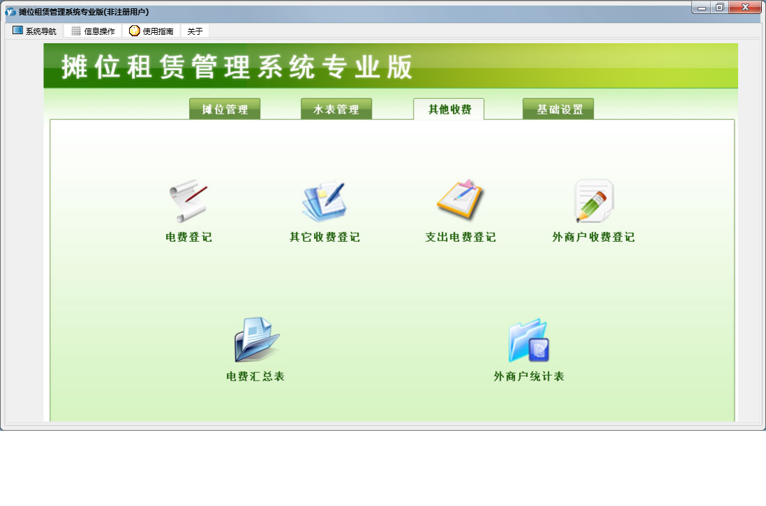 摊位租赁管理系统专业版包含以下功能:支出电费登记、基础设置、租赁信息查询、外商户收费登记、市场区域设置、已结算业务查看、其它收费登记、摊位信息、抄表录入、收费录入、摊位状态查看、权限设置、租赁结算、租赁登记、关于、摊位管理、其他管理、日志、电费登记、水表管理等