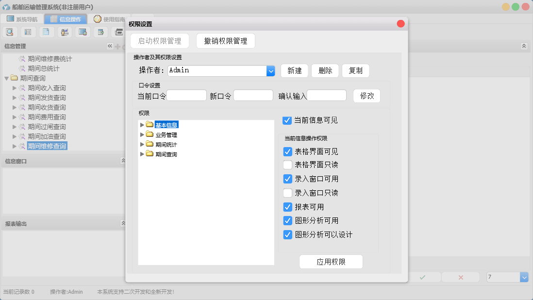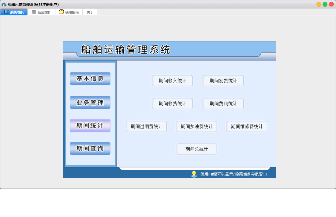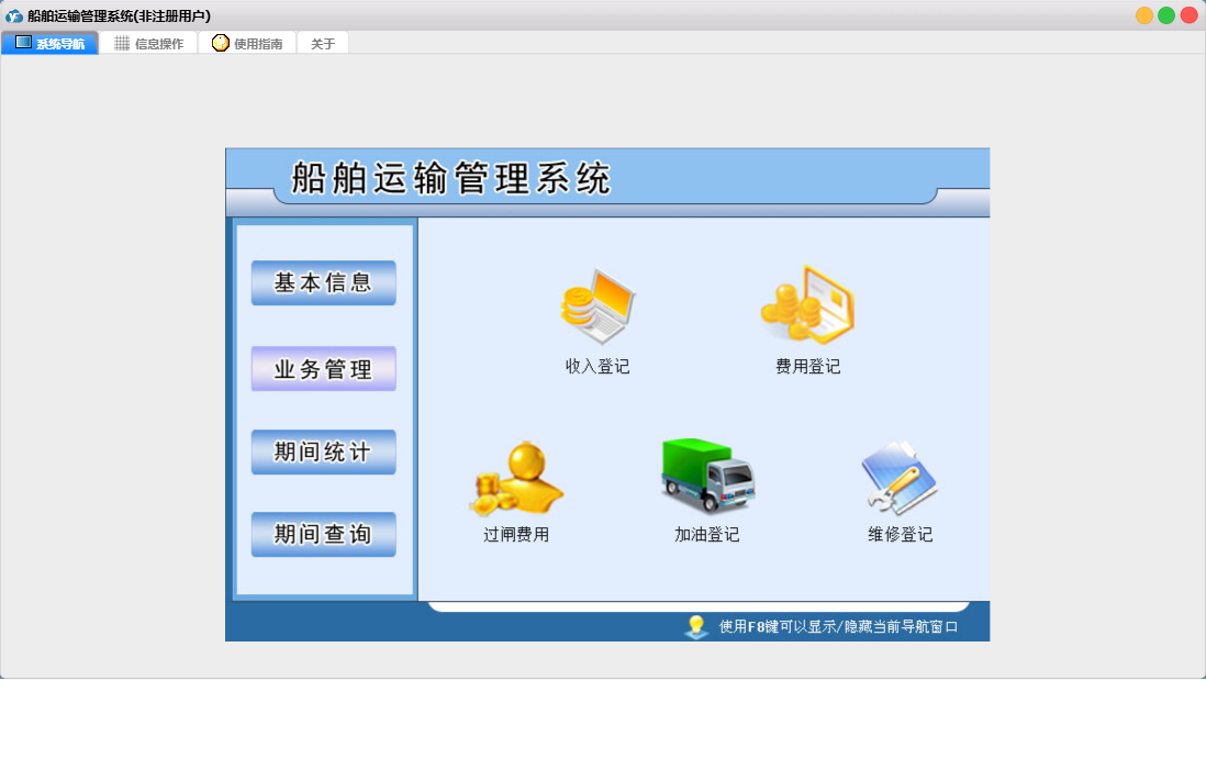 船舶运输管理系统包含以下功能:加油站信息、收货方信息、期间统计、船舶信息、收入登记、维修登记、日志、关于、基本信息、权限设置、期间查询、过闸费用、发货方信息、费用登记、加油登记、业务管理等
