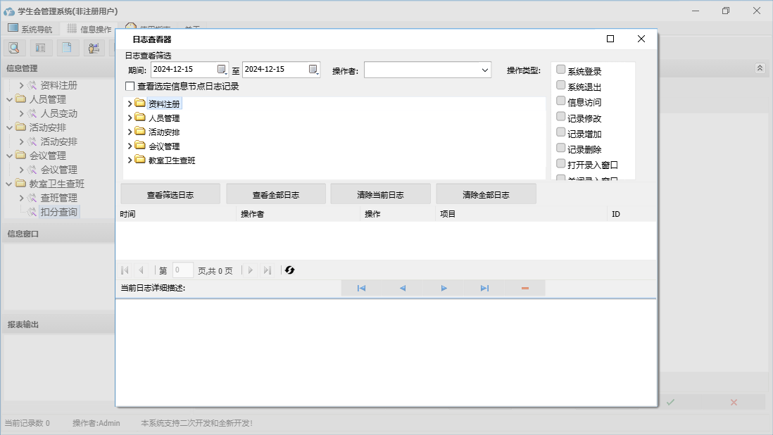 学生会管理系统包含以下功能:面板、会议管理、资料注册、人员变动、日志、关于、权限设置、活动安排、查班管理等