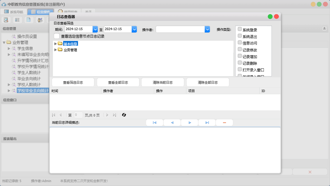 中职教育信息管理系统包含以下功能:学校领导信息、学校名称设置、毕业班信息、学生信息、日志、关于、权限设置、基本信息、未填写毕业去向明细、业务管理等