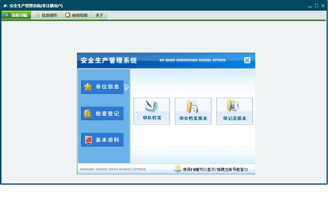 安全生产管理系统包含以下功能:培训记录、安全事故登记、检查登记、单位信息、基本资料、单位档案、会议记录、日志、设备年审登记、关于、权限设置、竞赛记录、安全检查登记等