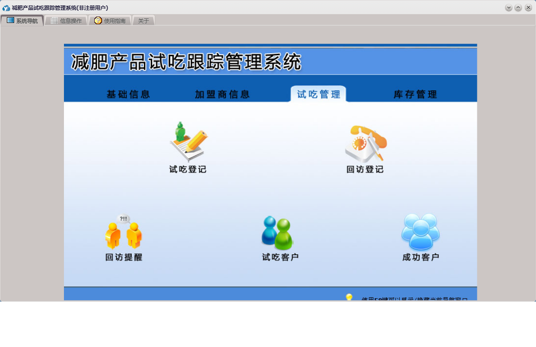 减肥产品试吃跟踪管理系统包含以下功能:单位信息、入库登记、加盟商信息、日志、库存管理、关于、销售登记、试吃登记、试吃管理、权限设置、基本信息、加盟商、产品信息、回访登记等