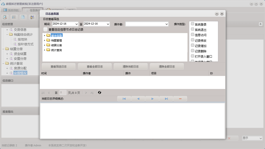 房屋拆迁管理系统包含以下功能:拆迁户、档案管理、房间信息、基本信息 基本设置、部门设置、单位设置、公司信息、安置分房、资金结算、权限设置、统计查询、拆迁地块、就近靠档、小区信息、结算分房、套型设置、关于、基本信息、补偿设置、楼栋信息、基本信息 小区管理、基本信息 评估公司、日志、人员设置、人员信息等