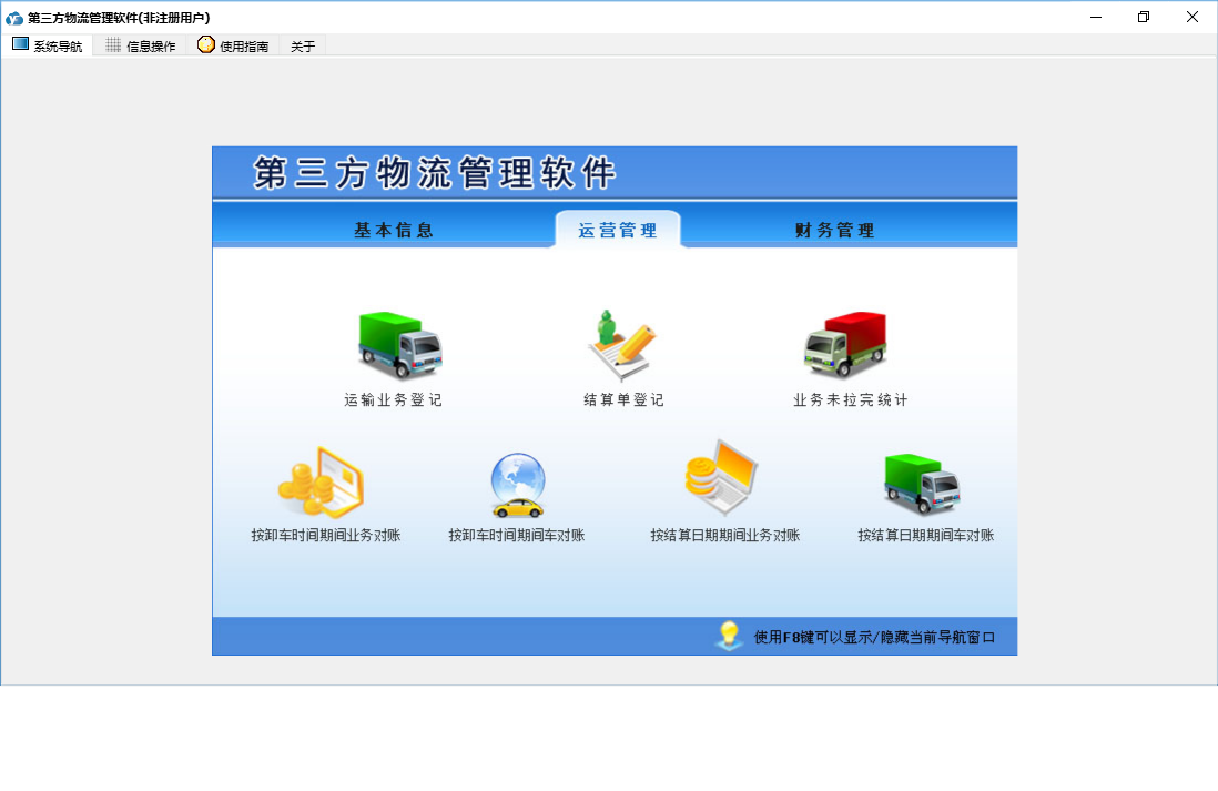 第三方物流管理软件包含以下功能:结算单登记、运营管理、付款登记、日志、运输业务登记、关于、权限设置、基本信息、收款登记、财务管理、车辆信息等